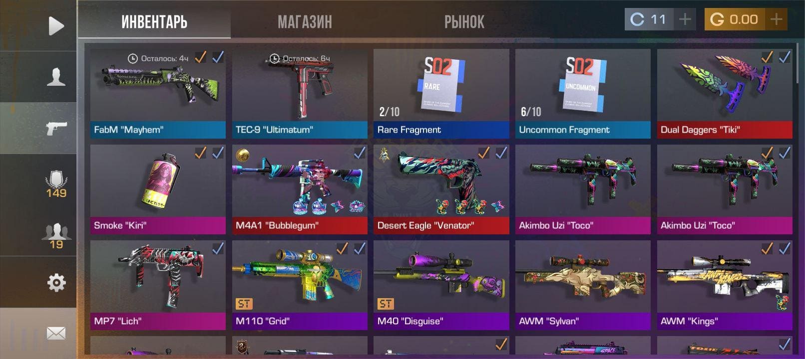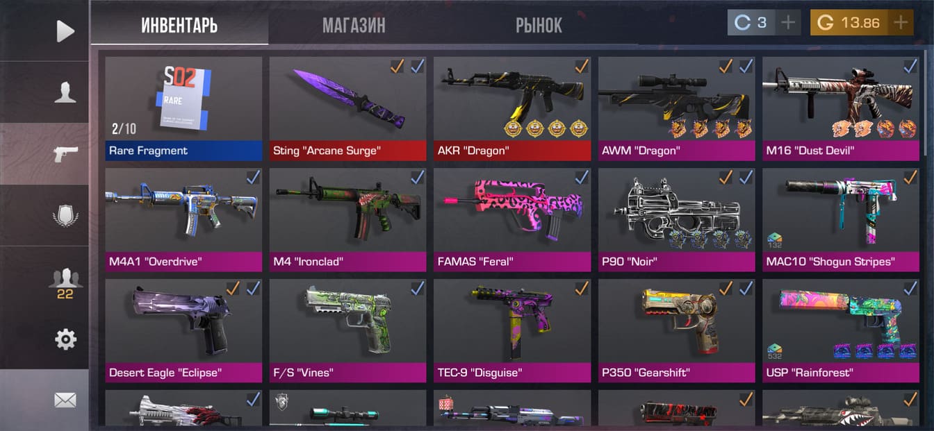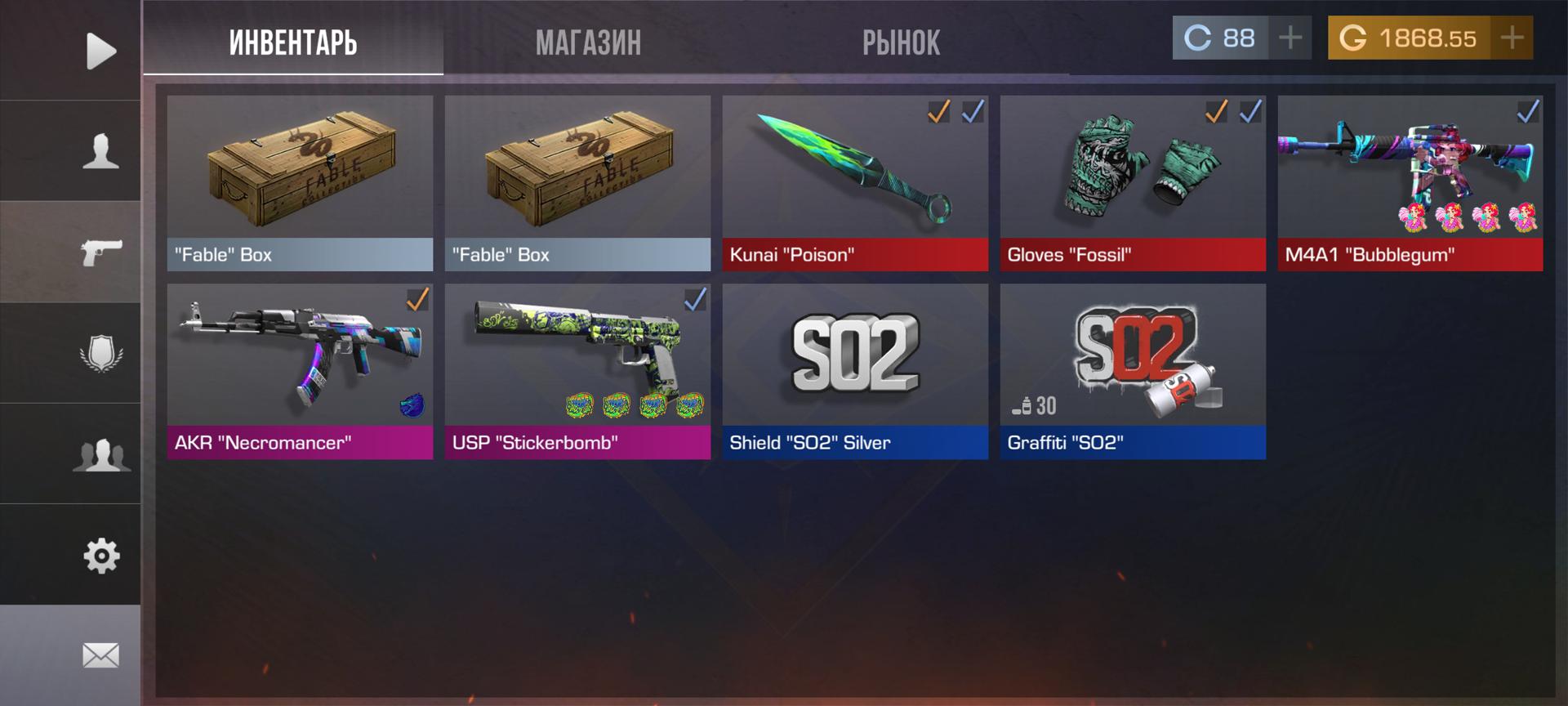 💰Голда: 1868.55; 🧤Перчатки: "Fossil"; 🔪Ножи: Kunai "Poison"; ⭐️Редкие скины: 3