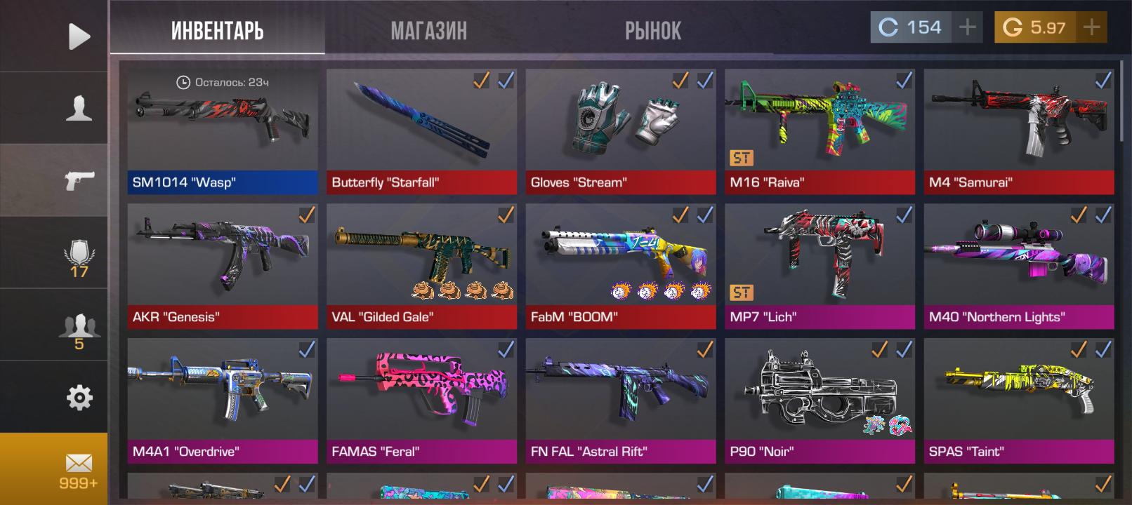 💰Голда: 5.97; 🧤Перчатки: "Stream"; 🔪Ножи: Butterfly "Starfall"; ⭐️Редкие скины: 13