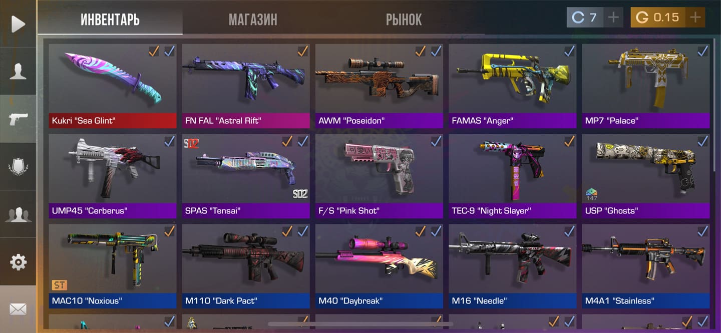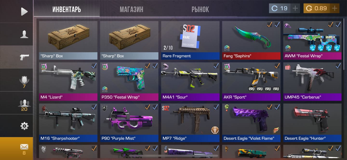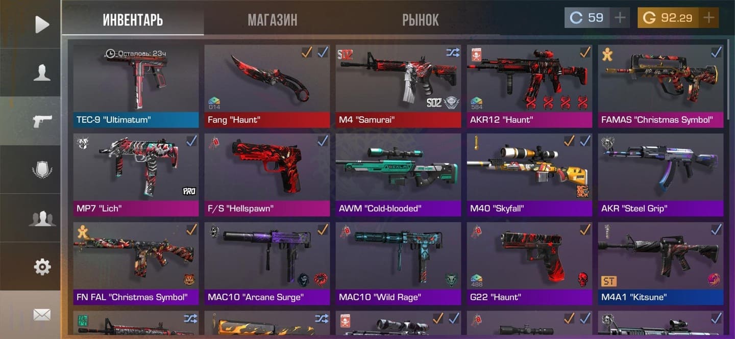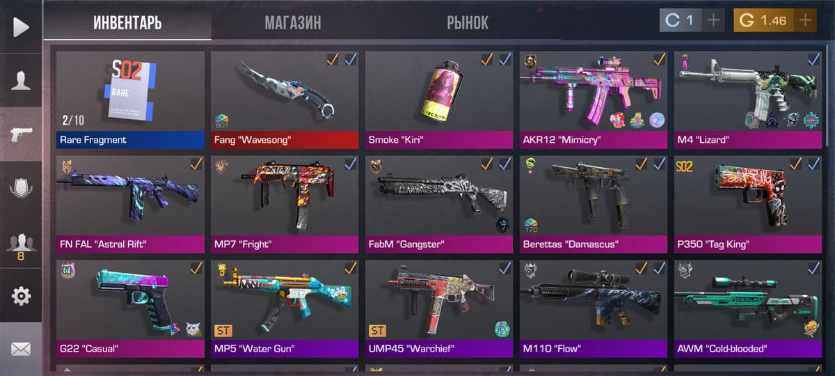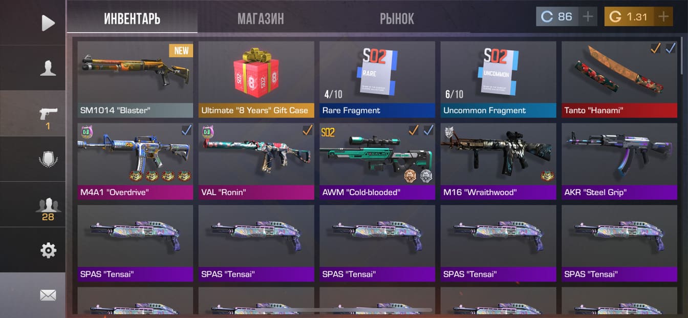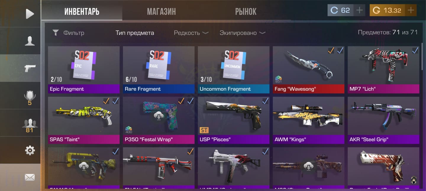 💰Голда: 27.02; 🧤Перчатки: "Hanami"; 🔪Ножи: Kunai "Wavesong", jKommando "Plasma" ⭐️Редкие скины: 4